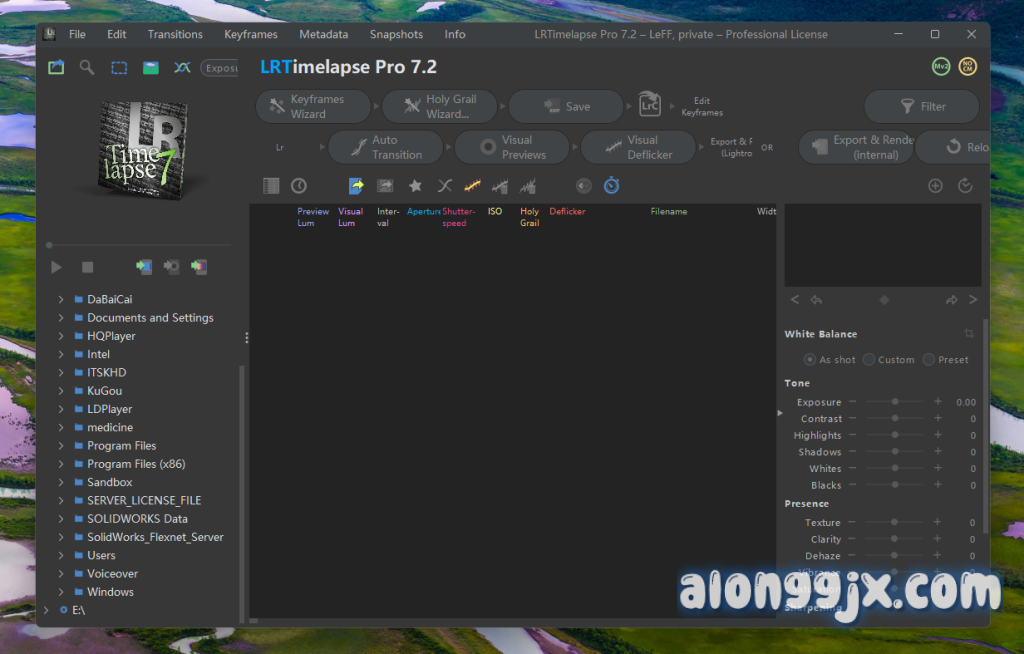 LRTimelapse Pro 是一款专为延时摄影设计的强大软件,能够为延时视频的编辑、关键帧动画、色彩分级和渲染提供全面解决方案。无论您使用哪种相机,LRTimelapse 都能将您的延时摄影提升到新的高度,支持原生 Mac 和 PC 版本,兼容 Raw、JPG 和 DNG 格式,并与 Lightroom Classic 无缝集成。它不仅支持超过 400 种 Lightroom 工具的动画和关键帧,还提供了无损多通道视觉去闪烁技术和独特的 LRT 动态模糊混合技术,确保最终效果超级流畅。