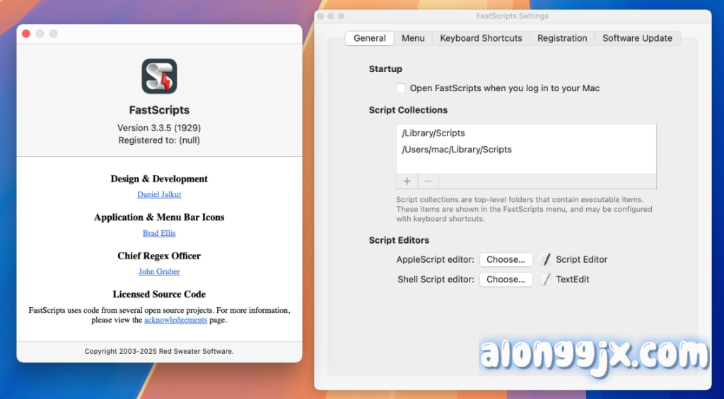 - 多语言脚本支持:支持AppleScript、Perl、Automator工作流,甚至可以添加完整应用程序和文档到脚本文件夹中,通过FastScripts调用。