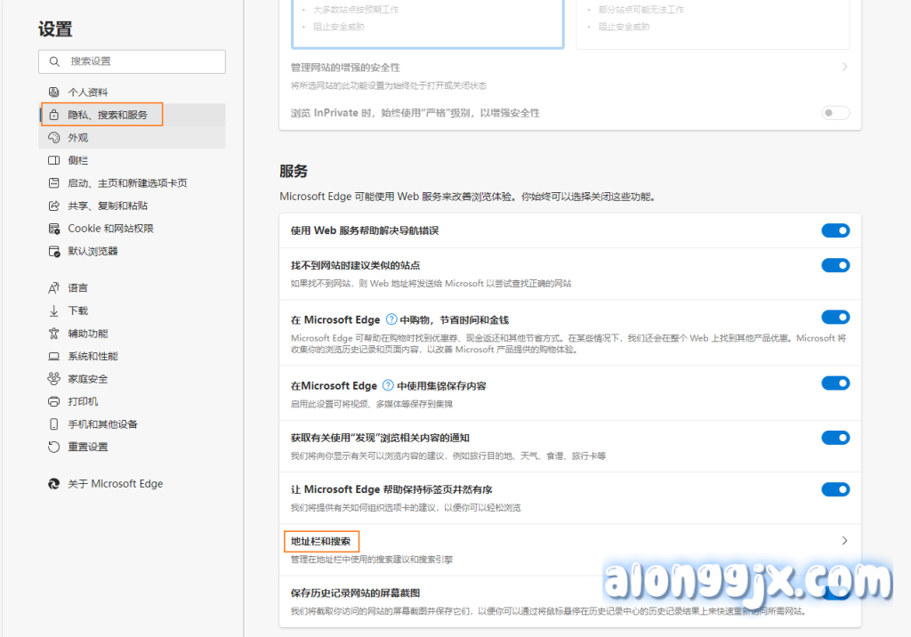 2、如果还是不能解决,请将浏览器默认搜索引擎选项改为除必应意外的其他,,比如百度。设置路径:浏览器设置-隐私、搜索和服务-服务-地址栏和搜索-管理搜索引擎-切为百度。