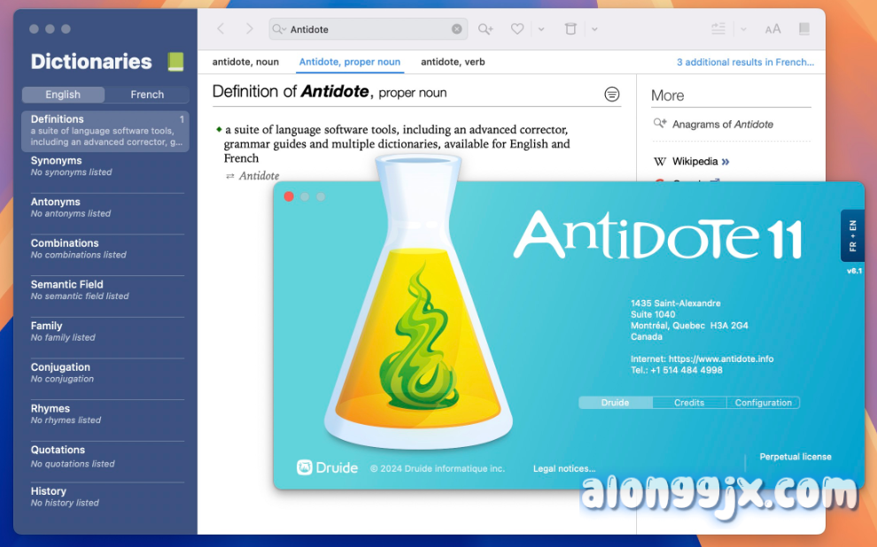 - 全面的词典资源:Antidote 12 提供了丰富多样的词典资源,用户可以轻松查找单词的定义,并通过同义词、反义词、短语、相关词汇或词族等关联词汇进行拓展。此外,软件还提供动词变位、音频发音、语言难点提示以及精选例句,帮助用户更精准地选择词汇。