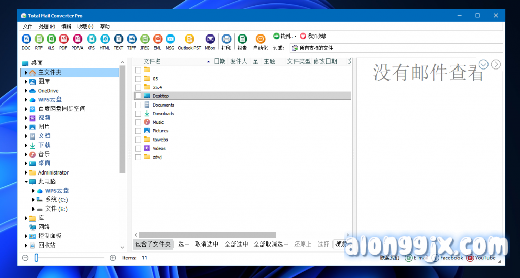 - 多格式转换支持:能够将电子邮件转换为PDF、PDF/A、DOC、XLS、XPS、HTML、XHTML、TXT、TIFF、EML、MSG、PST等格式。