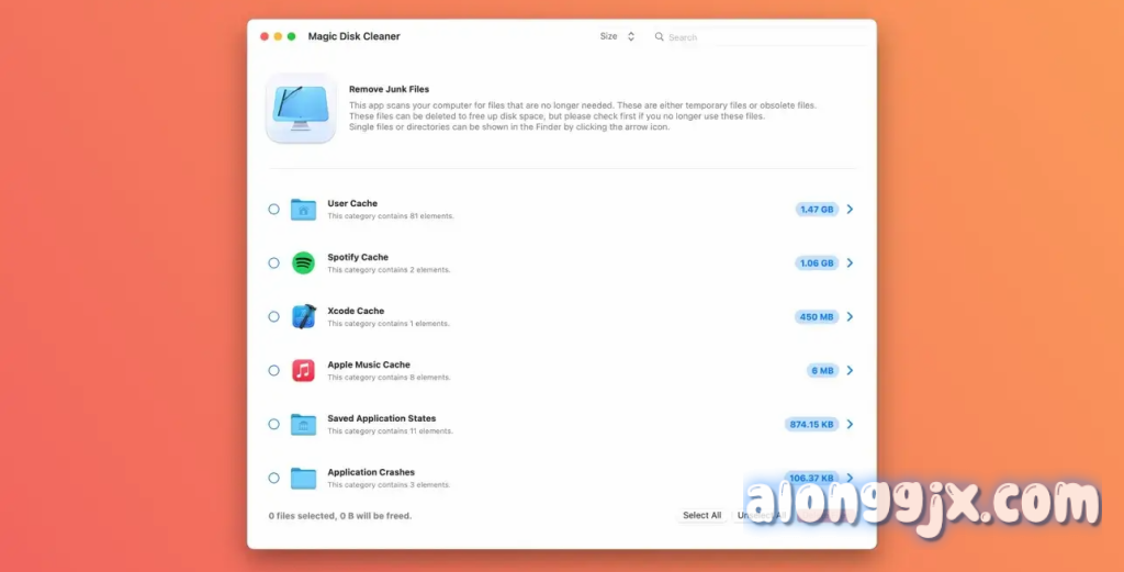 Magic Disk Cleaner 一款MAC上好用的系统清理工具。它可以发现并删除了浪费大量空间的文件临时文件。该应用程序的速度快如闪电,能在短时间内释放磁盘空间。