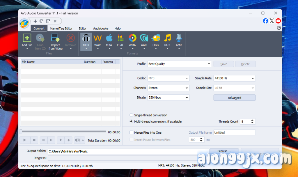 - 支持多种音频格式:支持 MP3、MP2、MP+、Ogg Vorbis、AAC、M4A、AMR、WMA、WAV、ADPCM 和 FLAC 等多种音频格式之间的转换。