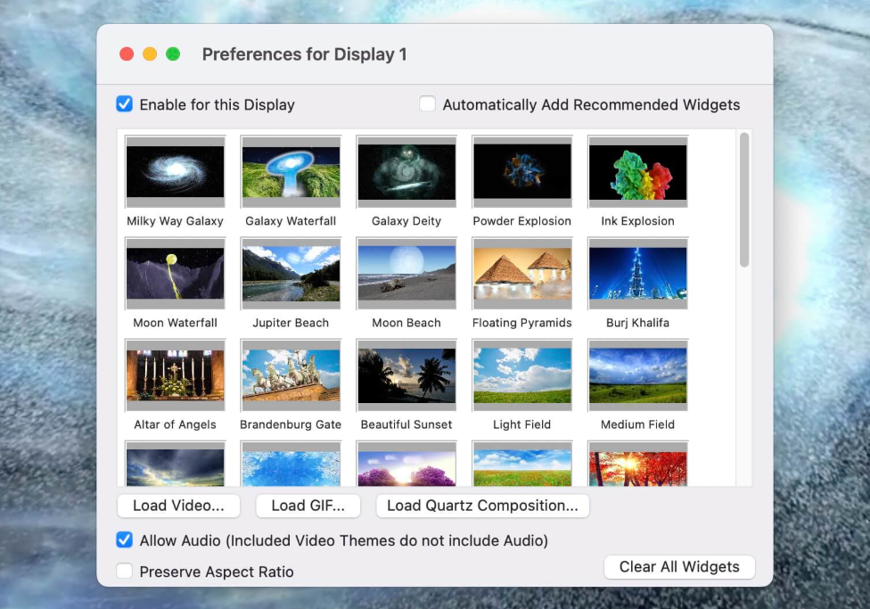 - 内置50种精美动态主题:涵盖太空、奇幻、建筑、自然、节日、水族馆、抽象等多个类别,所有主题均为预渲染视频,单显示器CPU占用不超过5%