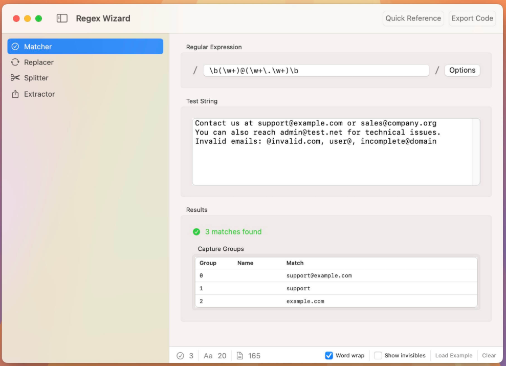 - 实时验证与反馈:输入正则表达式和测试文本后,Regex Wizard 会实时验证并给出匹配结果,让用户能即时看到正则表达式的效果,方便快速调整和优化。