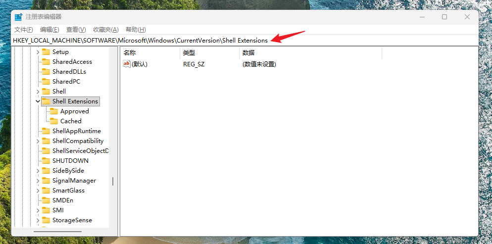 导航到指定的注册表路径,在注册表编辑器的地址栏中,复制并粘贴下面的路径,然后按回车,可以快速定位: