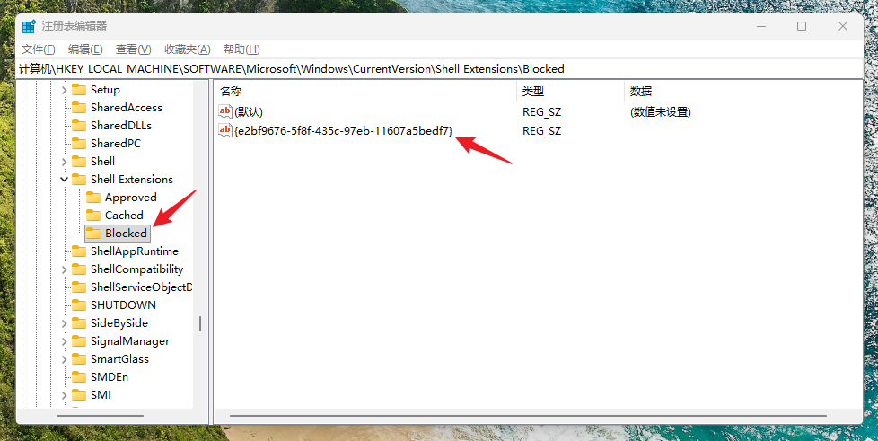 在 Shell Extensions上点击右键,选择 新建 -> 项。将新建的项命名为 Blocked(注意大小写)。