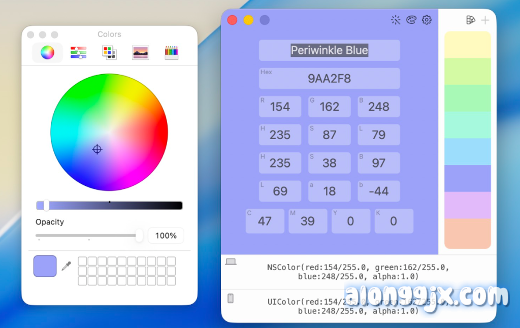 - 多格式代码片段生成:可即时输出HEX、RGB、HSL、HSB、Lab、CMYK等色彩值及Swift/Objective-C代码