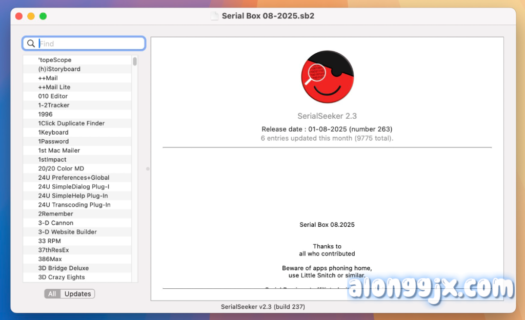 Serial Box for Mac是一款专为苹果电脑用户设计的软件序列号查询与管理工具,它通过整合庞大的序列号数据库和提供便捷的查询工具,帮助用户快速查找和激活各类Mac软件。这款工具以其每月更新的数据库资源而闻名,确保用户能够获取到最新、有效的软件序列号,被许多Mac用户誉为“序列号神器”或“骷髅头”工具。Serial Box本质上是一个数据文件包,需要配合专用的阅读器程序(如iSerial Reader或SerialSeeker)使用,通过两者的结合,用户可以方便地浏览和检索数千款Mac软件的注册码和激活信息。