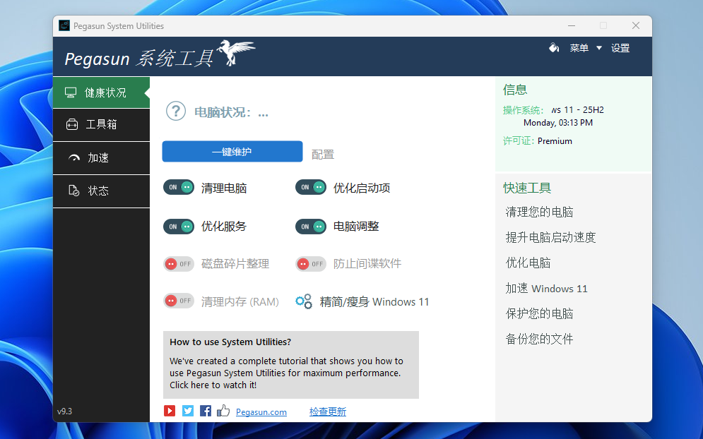 Pegasun System Utilities 是一款功能全面的Windows电脑优化软件,旨在通过一键操作提升系统性能、延长电池寿命并加强安全防护。它集成了超过28种工具,能够自动执行清理、修复、加速和保护任务,帮助用户轻松解决电脑卡顿、空间不足和隐私风险等问题,让老旧电脑焕然一新。