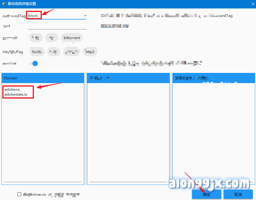 如图设置,上方选择block,将下方domain框内输入两个域名,确定保存句