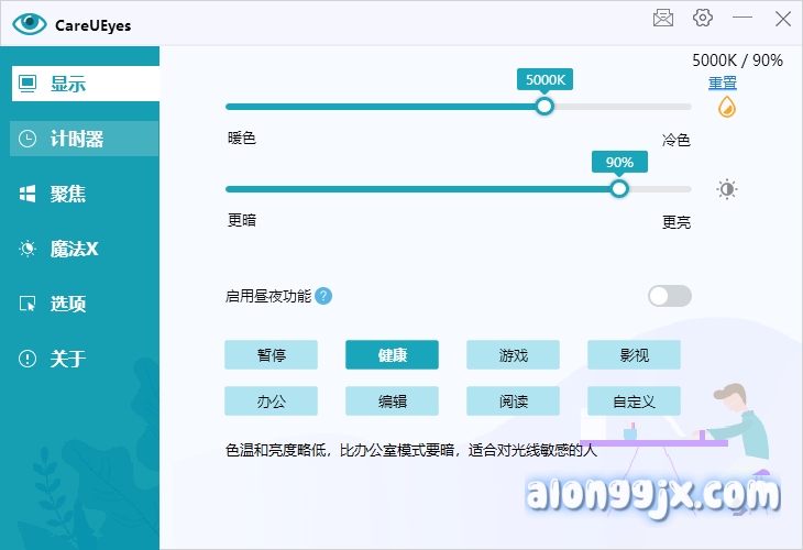 CareUEyes 是一款专为电脑用户设计的视觉保护软件,提供蓝光过滤、亮度调节、休息提醒等功能,旨在减少眼疲劳并提高工作效率。