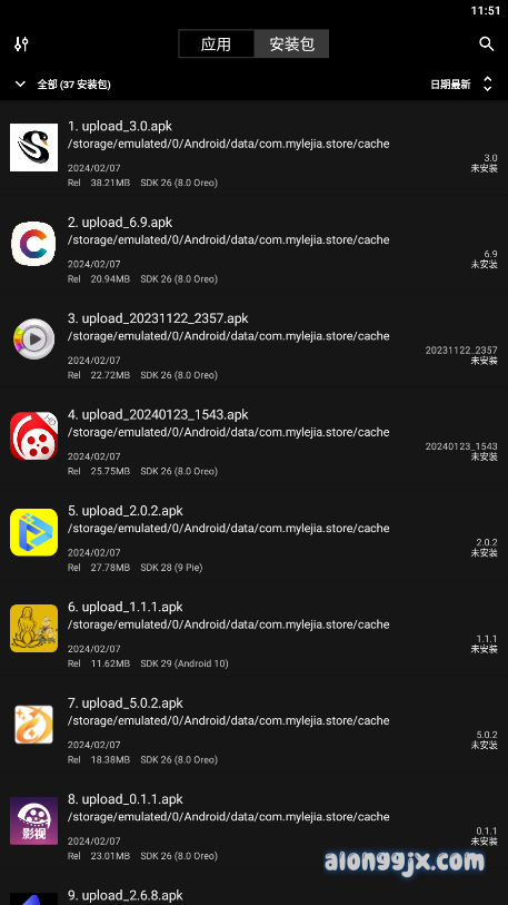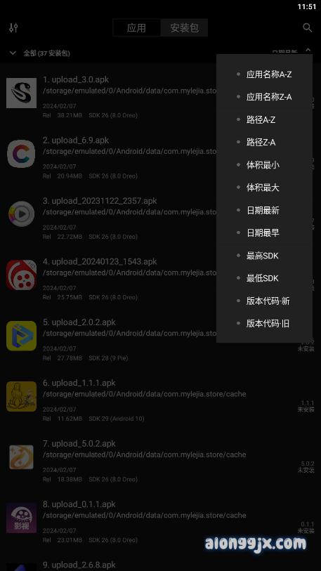 - 按名称、包名称、安装和更新日期、应用程序大小(升序或降序)对应用程序进行排序