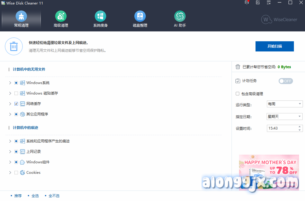 Wise Disk Cleaner 是一款磁盘清理碎片整理软件,可查找和删除随时间累积的常见垃圾文件。Wise Disk Cleaner 预配置了大约 50 种文件扩展名类型,这些文件扩展名通常被认为是一次性的,您可以通过添加自己的文件类型来扩展范围。