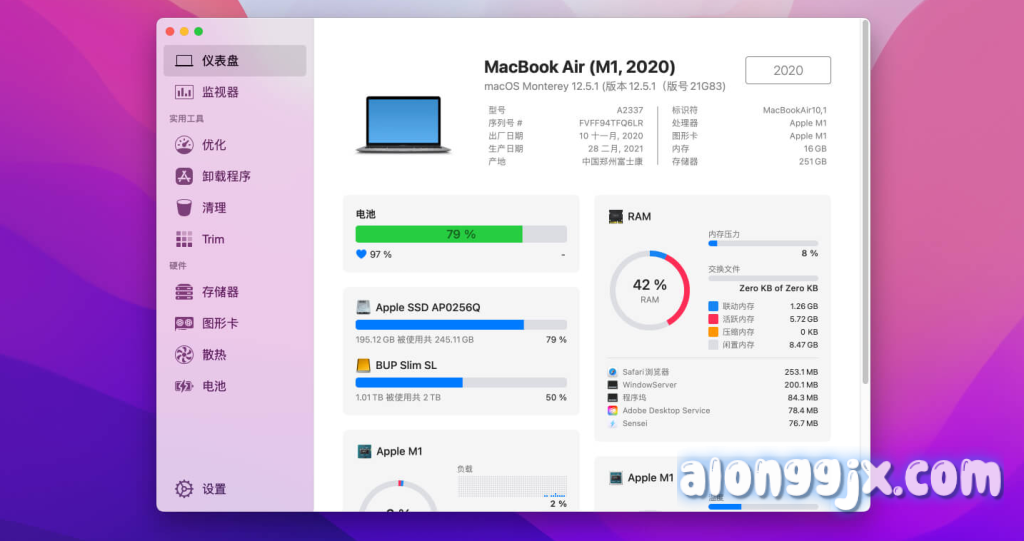 硬件实用程序方面,Sensei 提供了硬盘健康报告、电池健康检查、热量仪表板、磁盘基准测试、SSD 装饰等功能,帮助用户保护数据、提前发现硬件问题、优化性能和延长设备寿命。此外,Sensei 还提供了详细的硬件信息和性能监控功能,用户可以通过 Mac 状态栏查看实时硬件统计信息。