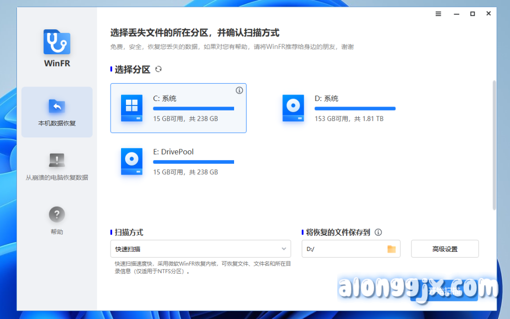 - 安全免费: WinFR 是一个完全免费的工具,无论使用哪种扫描方式或恢复哪种类型的文件,均不收取任何费用。