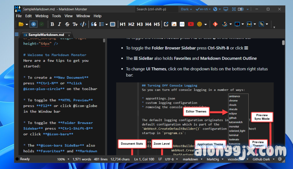 Markdown Monster 是一个 Markdown 编辑器和查看器,允许您通过突出显示语法和快速输入文本来编辑 Markdown。通过可折叠的同步实时预览,您可以在键入时查看输出。您可以轻松地将图像、链接、表情符号和代码嵌入为文本,或者使用我们温和的 UI 助手来简化许多操作。您也可以将图像直接粘贴并拖动到编辑器中。