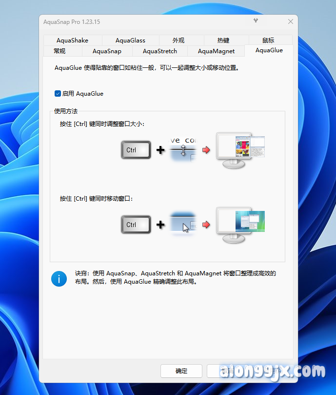- 鼠标快捷方式: 为窗口边框的每个可点击元素添加额外功能,通过鼠标快捷方式访问所有 AquaSnap 功能。