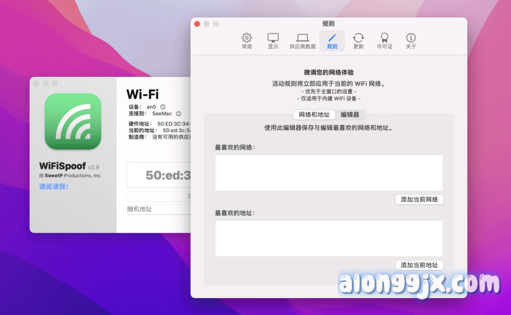 WiFiSpoof 是一款用于快速轻松地更改Mac计算机MAC 地址的工具,提供隐私保护,适用于 macOS 11+。