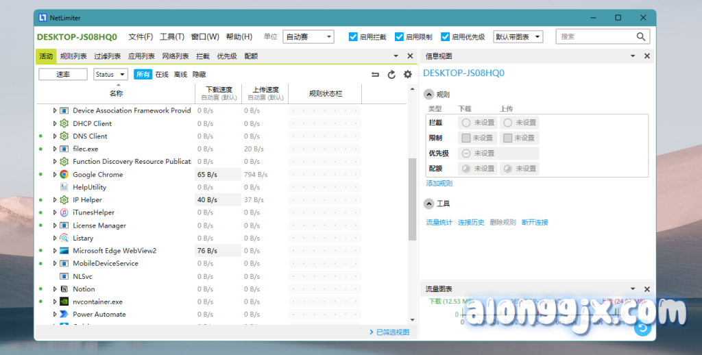 - 互联网流量监控:实时监控应用程序向互联网或其他网络传输的数据量,并提供实时交通图表。