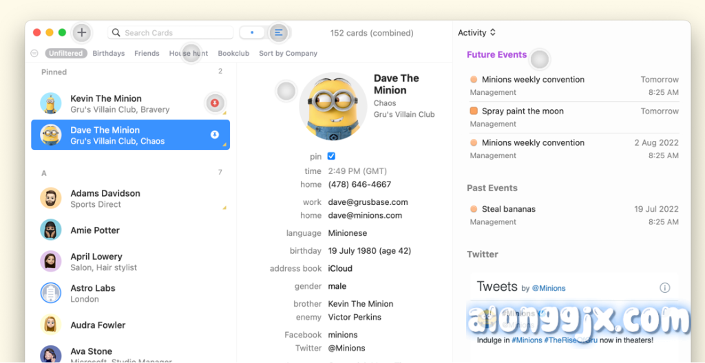 BusyContacts 是由 BusyMac 开发的一款专为 macOS 设计的高效联系人管理应用。它支持自然语言快速创建联系人,可以通过智能筛选和地址薄集合聚焦于特定的联系人。用户可以通过活动时间线查看联系人的活动,包括事件、会议、日记条目(需要 BusyCal)和 Twitter 动态。集成的信息面板允许用户快速查看和编辑事件和任务。此外,还可以对组织中的联系人进行分组和排序。