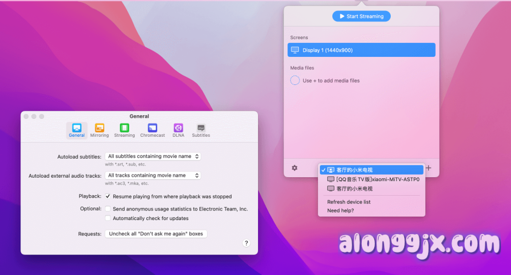 - 无线流媒体:JustStream 允许用户将 Mac 上的视频无线流媒体到智能电视、Apple TV、Chromecast 等设备。