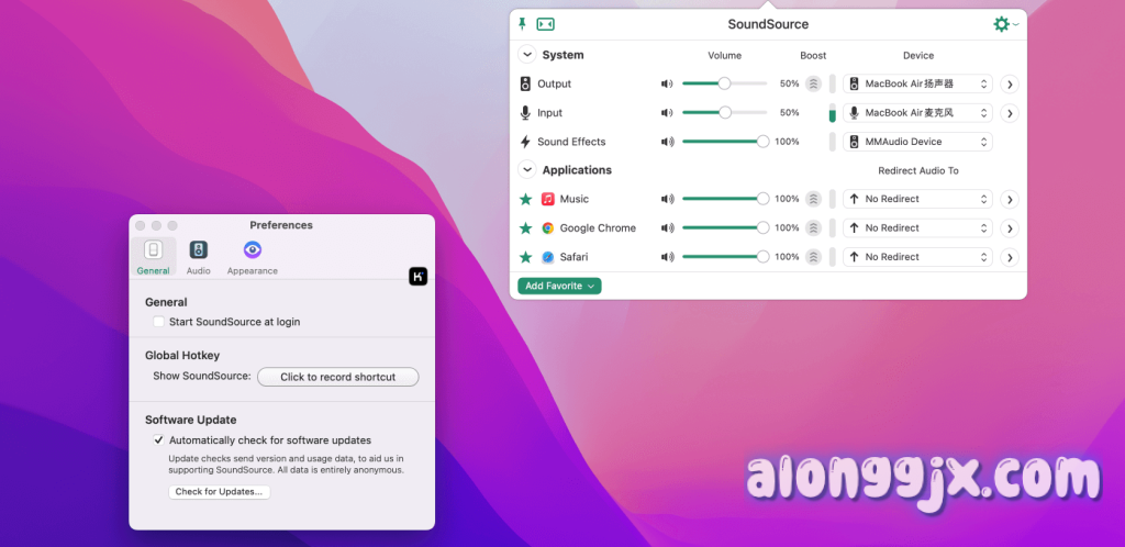 - 系统音频设备快速访问:通过菜单栏直接控制 Mac 的输出、输入和声音效果设备。
