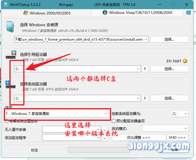 3、选择引导驱动器和磁盘安装的位置这两个选项都选 C 盘,下方选项里可以选择版本,家庭版、专业版等等根据你自己需求选择