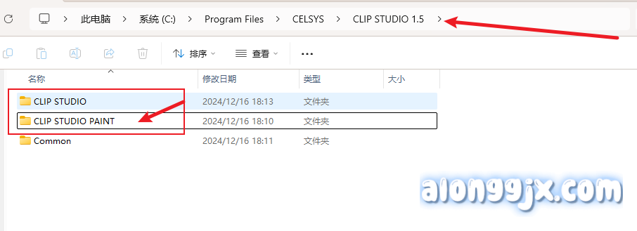 1、打开软件根目录,具体看你安装位置我这里以C盘为例。下面包含CLIP STUDIO和CLIP STUDIO PAINT两个软件。