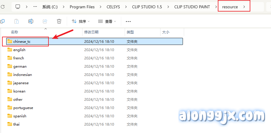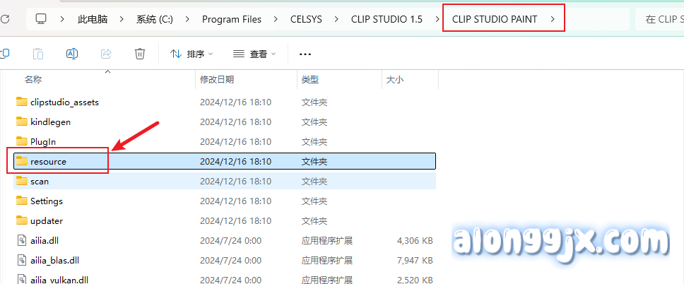 2、其中两个软件设置方法都是一样的,我以修改CLIP STUDIO PAINT界面为例,找到CLIP STUDIO PAINT文件夹下的resource文件夹。
