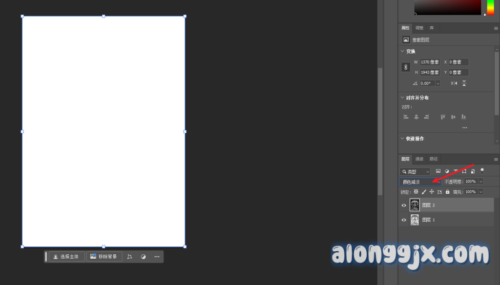 4、选中反向的图层,箭头指示位置的混合模式改为“颜色减淡”,这时候的图片变为全白。